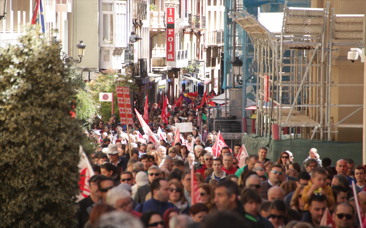 Alrededor de 1.500 personas han secundado en Logroño la manifestación con la que los sindicatos CCOO y UGT han exigido un cambio de políticas para crear empleo estable y de calidad, y mejorar los salarios.