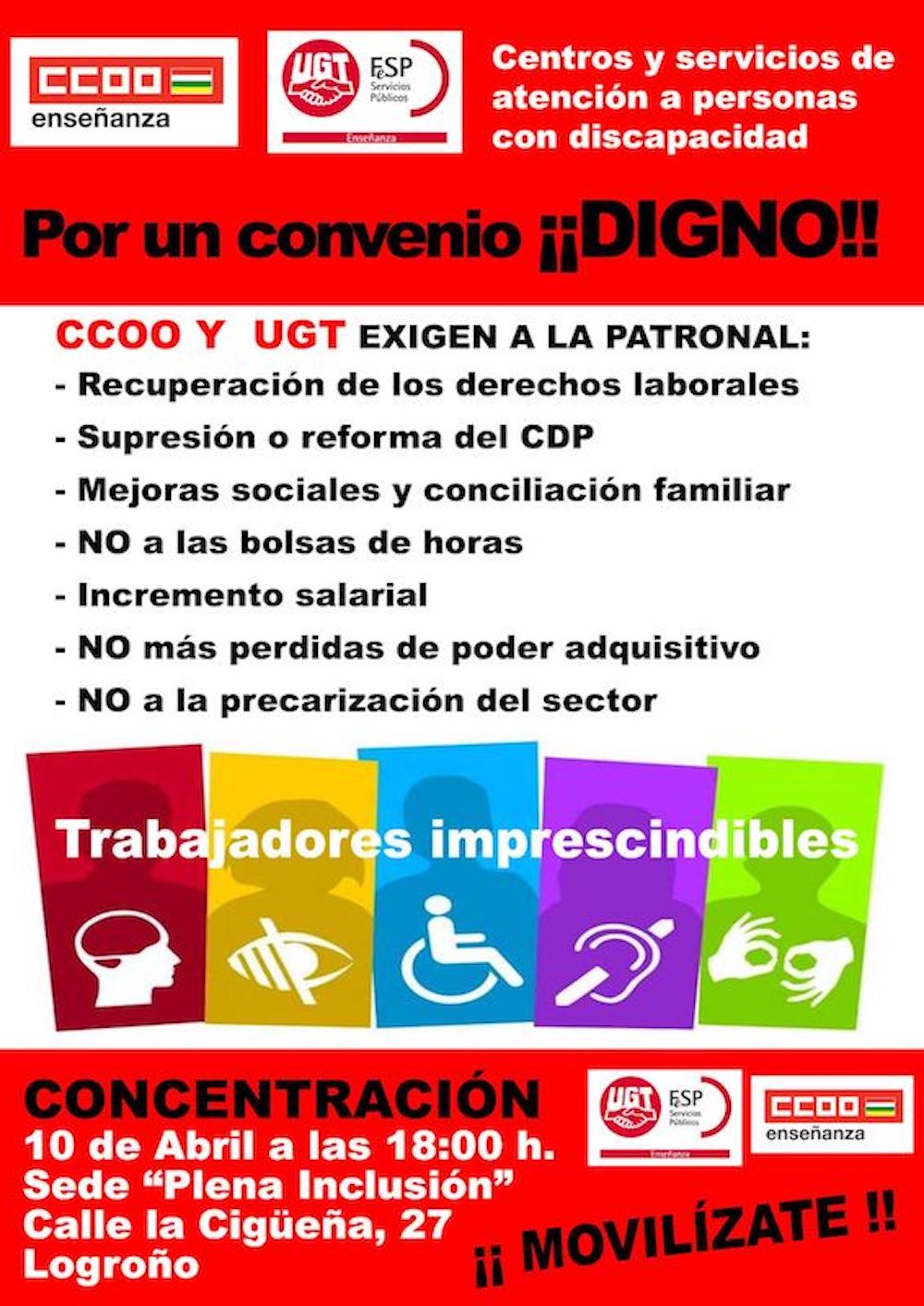 El convenio para los centros y servicios de atención a personas con discapacidad debería haberse puesto en marcha hace más de un año, pero no se ha avanzado nada. Los trabajadores necesitan un convenio digno, para recuperar los derechos perdidos. Ante la actitud inmovilista de la Patronal, CCOO ha convocado, junto a UGT, una concentración este miércoles a las 18:00 horas en la calle La Cigüeña de Logroño, junto a la sede de Plena Inclusión.