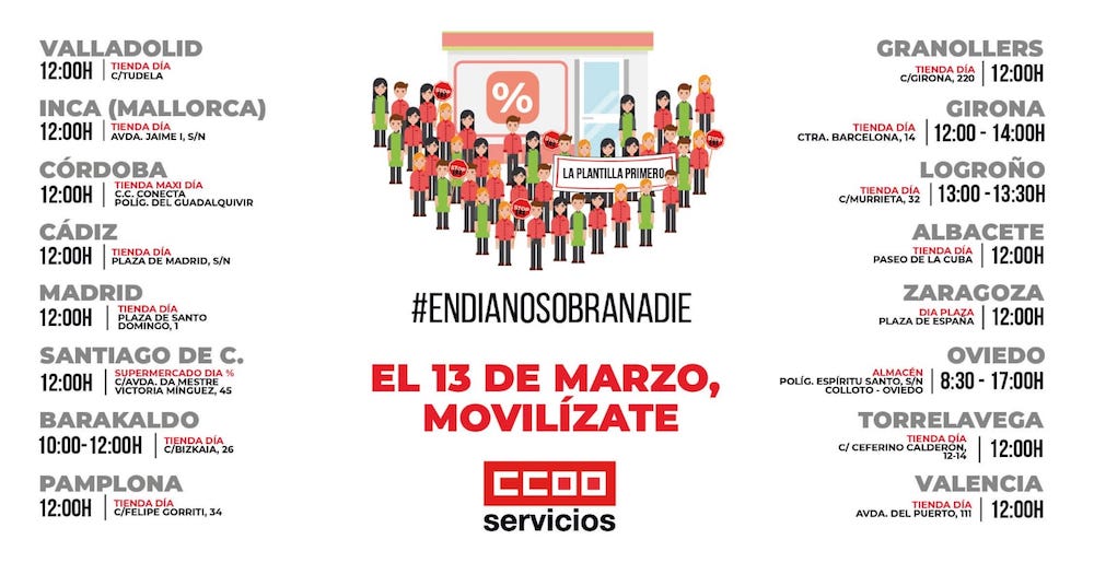 CCOO considera que el mayor y mejor motor de DIA en los últimos años ha sido su plantilla y no es de recibo que sean los pagadores de los desmanes de los gestores. La situación actual es una oportunidad para dotar a las tiendas de plantilla estable y suficiente, y de reforzar la cualificación de las personas que van a sacar a DIA de esta situación, que no son otras que sus trabajadoras y trabajadores.
