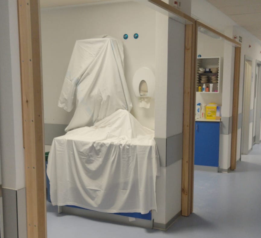 Por otra parte, las instalaciones son inadecuadas para una situación de pandemia, a la falta de la adecuada definición del necesario doble circuito CVOVID/NO COVID se suma la ausencia de cerramiento de los boxes de atención a pacientes, la cual ha debido ser afrontada apresuradamente, durante el último fin de semana, de forma provisional mediante cerramientos de madera opacos que no llegan al techo (IMÁGENES 2-5):