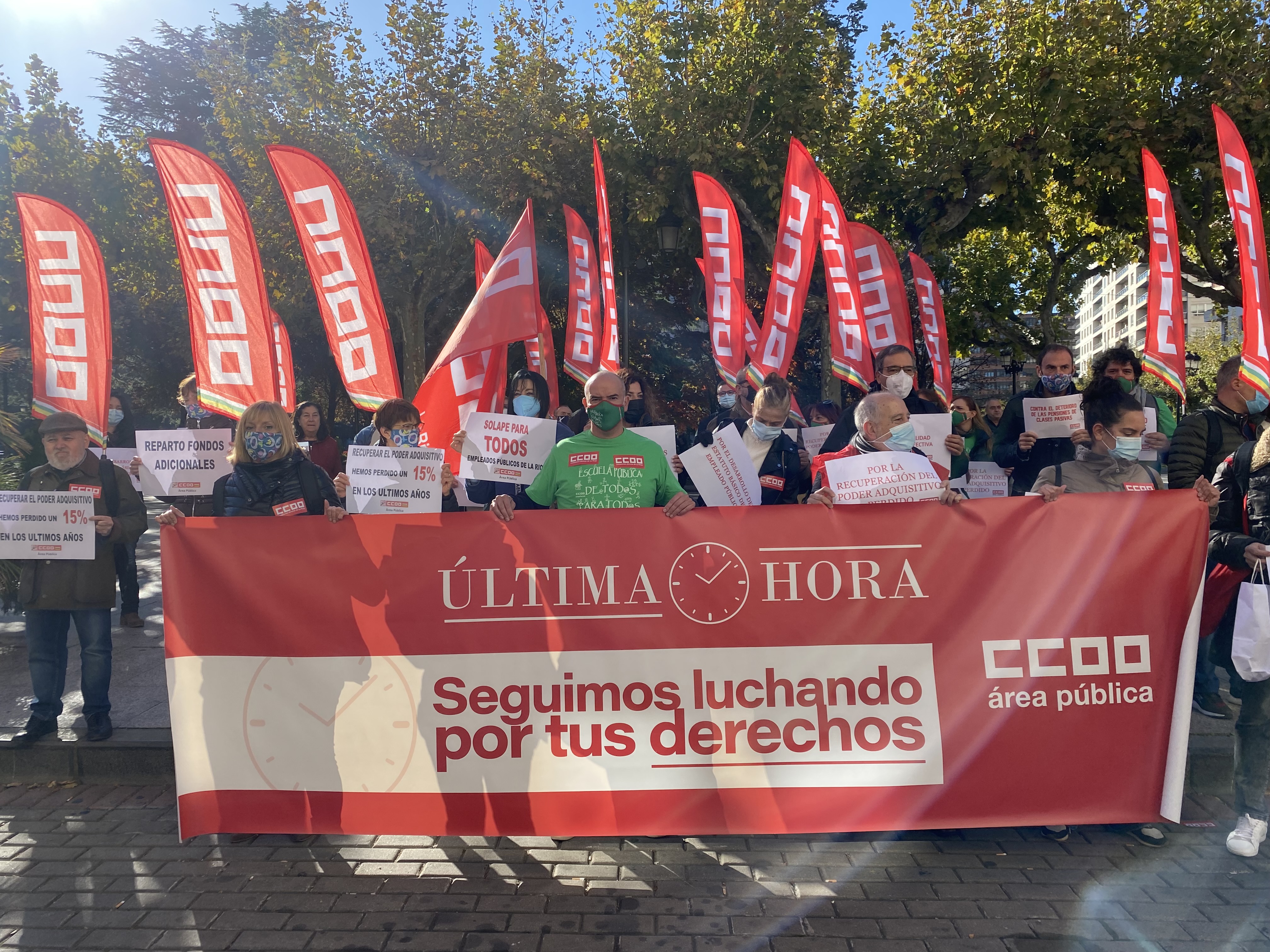 El Área Pública de CCOO de La Rioja se ha concentrado frente a Delegación de Gobierno este miércoles para exigir un aumento del gasto público en los servicios que garantizan los derechos de la ciudadanía, así como para lograr la recuperación de los derechos arrebatados a los más de tres millones de empleadas y empleados públicos de España, más de 10.000 en La Rioja.