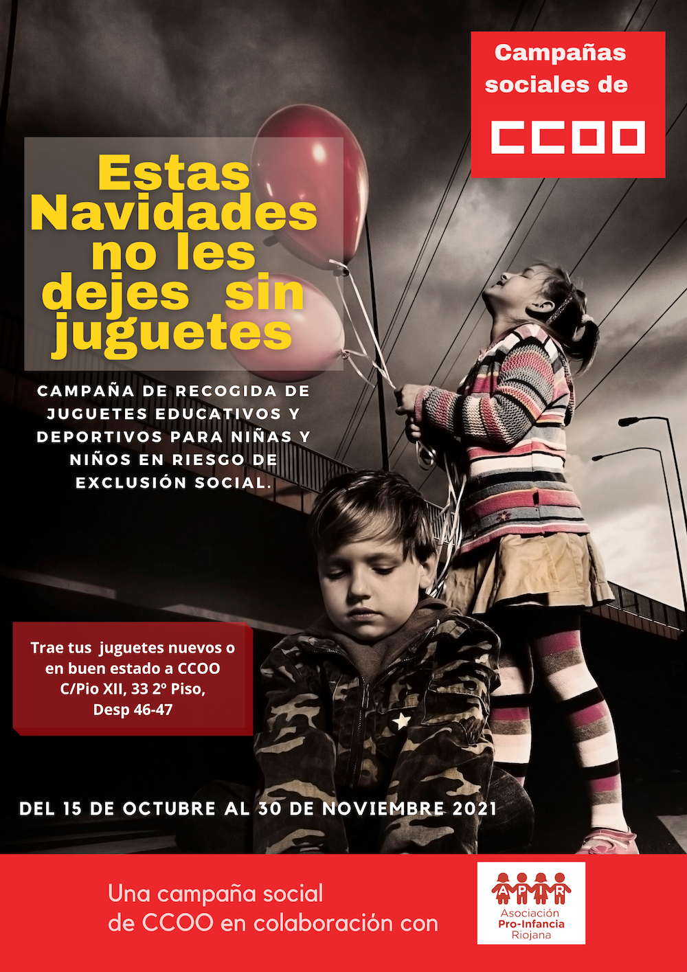 Los juguetes podrán entregarse en CCOO C/Pio XII, 33 2º Piso, Desp 46-47 en la federación de industria. En la sede de Arnedo llamando al 638449843. y en las empresas colaboradoras en la campaña y que lo anunciarán en los tablones de sus centros.