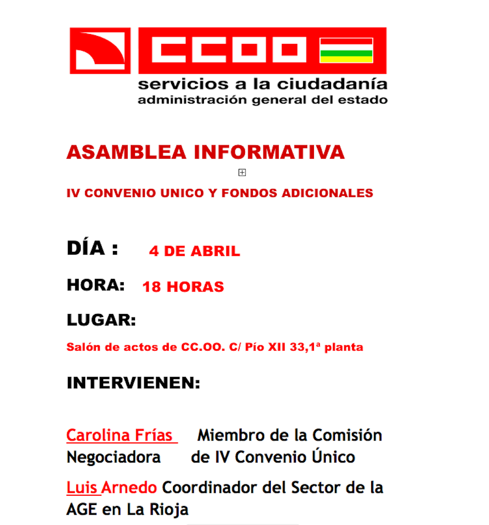 Con motivo de la firma del IV Convenio Único de la AGE y de los fondos adicionales, se convoca asamblea informativa para todos los empleados públicos de la AGE.