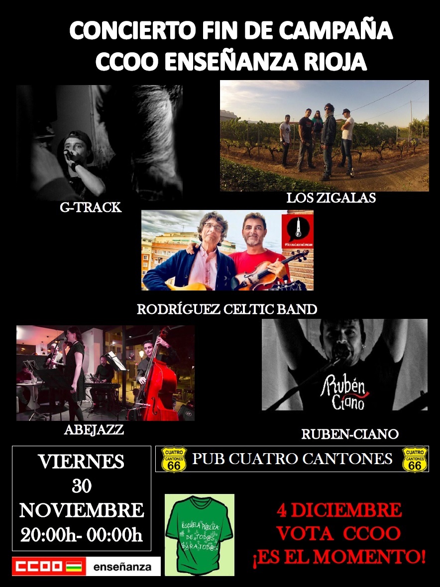 El próximo viernes, 30 de noviembre, la Federación de Enseñanza de CCOO ha organizado un concierto en el Pub Cuatro Cantones de Logroño para celebrar el fin de una intensa campaña para las elecciones sindicales que se celebrarán el martes, 4 de diciembre.