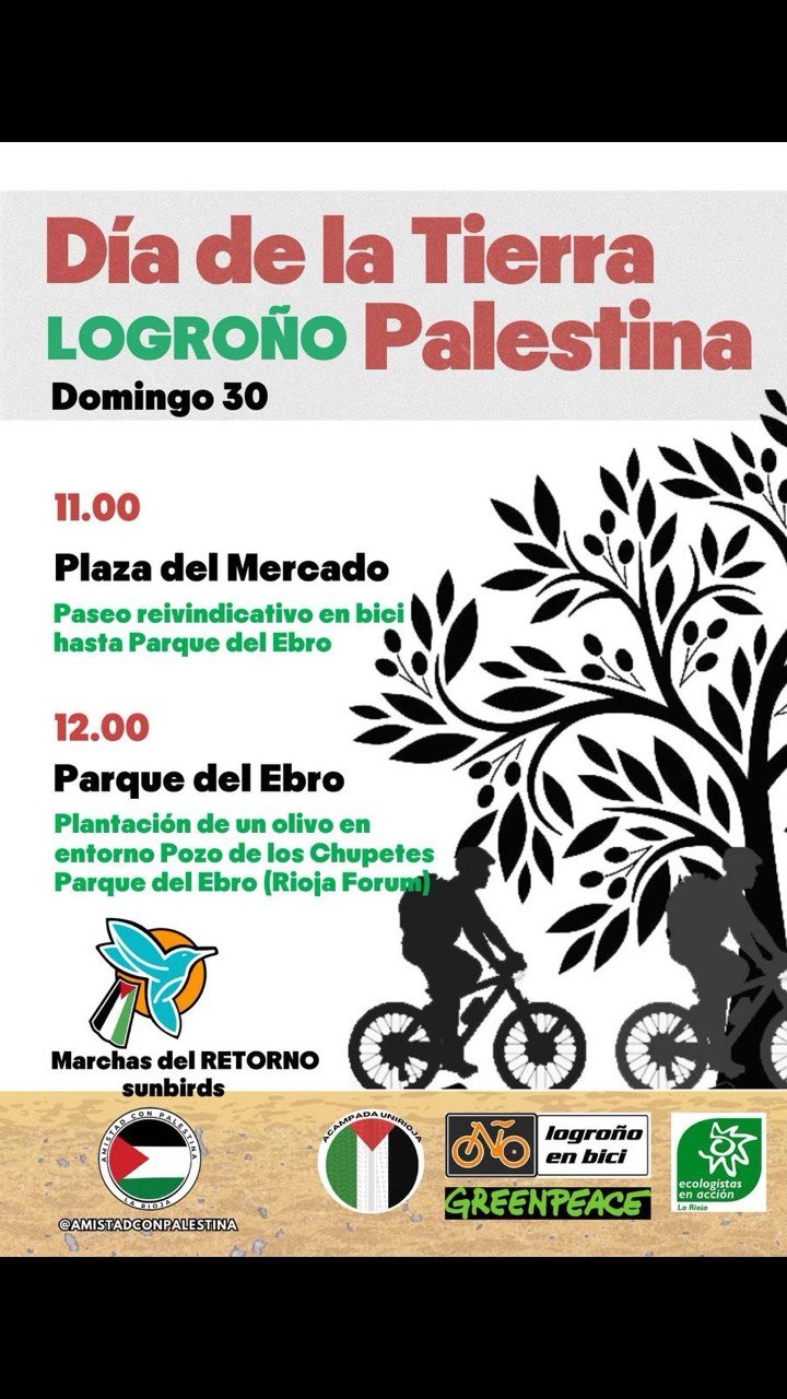 El domingo 30 de marzo conmemoramos el Día de la Tierra Palestina, Amistad con Palestina ha organizado un paseo reivindicativo en bici desde la Plaza del Mercado al Parque del Ebro. Saldrá a las 11.00.