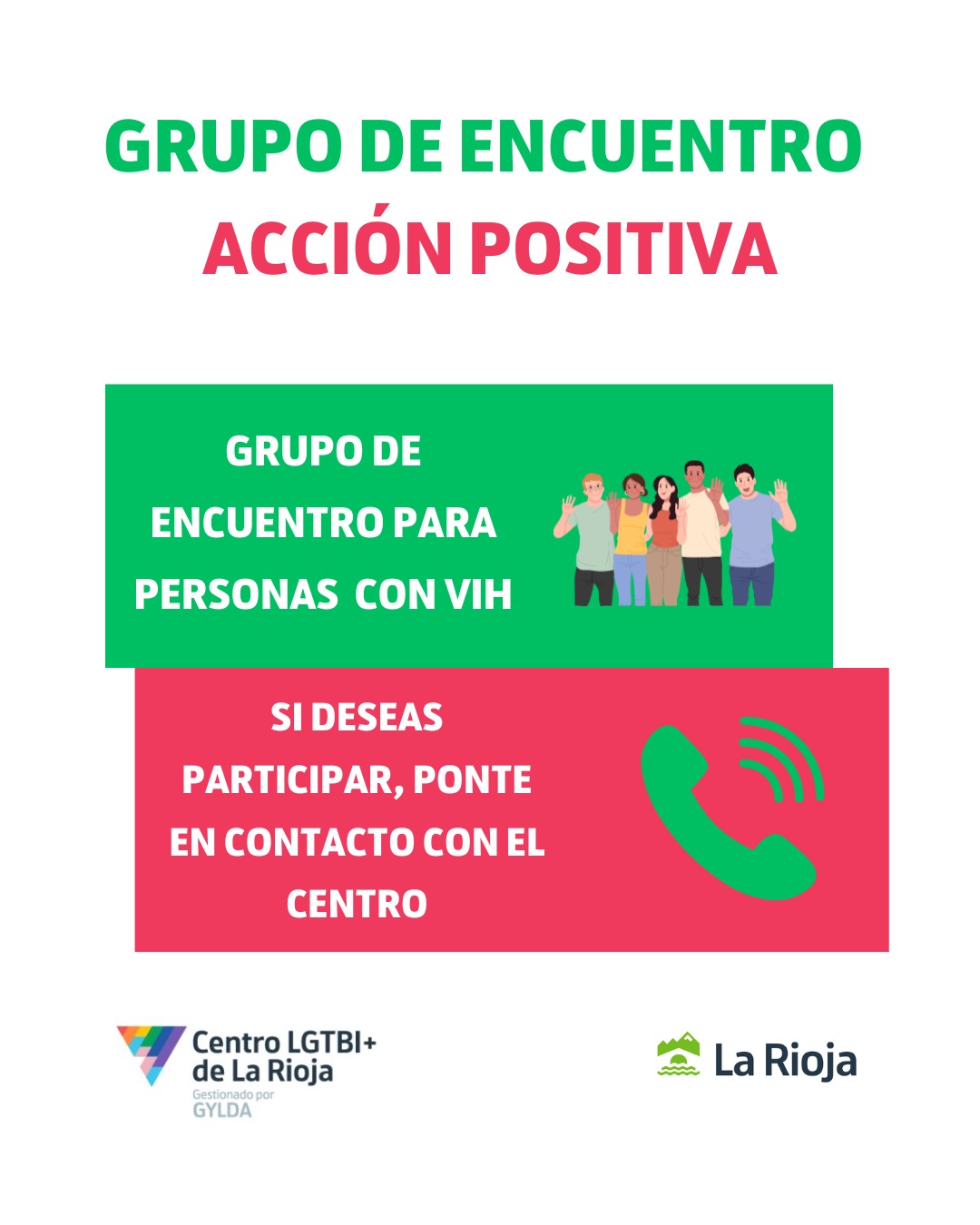 El Centro LGTBI+ de la Rioja, gestionado por GYLDA, mantiene activo su grupo de apoyo «Acción Positiva». Se trata de un espacio de encuentro seguro y confidencial destinado específicamente a personas con VIH, donde compartir experiencias, apoyo mutuo y herramientas para el bienestar personal y social.
