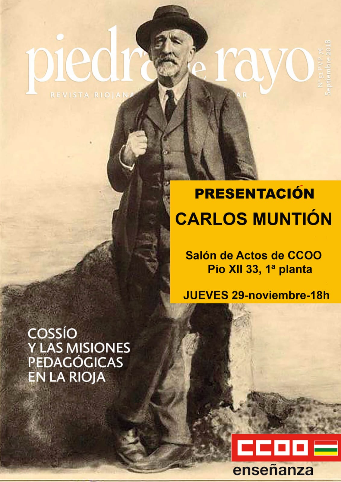 Carlos Muntión presentará en el Salón de Actos de CCOO el último número de la revista ‘Piedra de Rayo’ dedicado a Cossío y las migraciones pedagógicas en La Rioja.