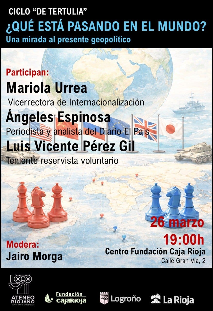 Ciclo de tertulia con Mariola Urrea (vicerrectora de Internacionalización de la UR), Ángeles Espinosa (periodista y analista del diario El País) y Luis Vicente Pérez Gil (teniente revista voluntario)