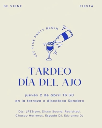 Después del Festival del Ajo Asado en Arnedo, tardeo en la terraza y en el interior de la discoteca Sendero. El jueves 2 de abril a las 16.30 horas con los djs LP33rpm, Disco Sound, Revisited, Chusco Herrero, Espada DJ, Edu anmu DJ.